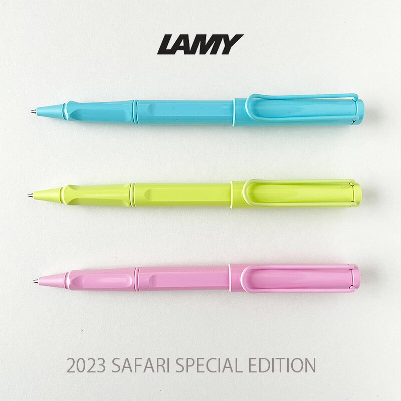 ドイツの筆記具ブランドLAMY(ラミー)の2023年サファリ限定色は、 新たな季節の訪れを予感させるスプリンググリーン、アクアスカイ、ライトローズ。 つややかな光沢仕上げのバレルに、クリップ、ノックボタンなどディテールまで同色で統一したスペシャルエディショ ンです。 溢れる喜び(Delight)、はずむ気分にぴったりな三色です。 世界中で人気のLAMY(ラミー)サファリは軽く、丈夫な樹脂性ボディ、...