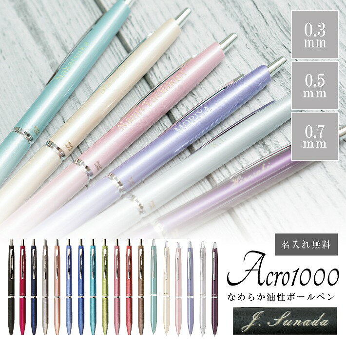 名入れ ボールペン パイロット アクロ1000 BAC-1SEF 0.5mm / BAC-1SF 0.7mm なめらかな筆記が特長の「アクロインキ」を採用したスリムタイプの油性ボールペン。 ボディの先端が太く、握りやすい形状。重心が前方にあり、安定した筆記を実現します。 アクロボールに使用しているアクロインキは、粘度を一般的な油性ボールペンの1/5にすることで、水性に近いサラサラなインキになり、ボ...