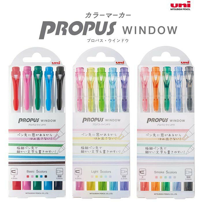 ■三菱鉛筆 カラーマーカー プロパス・ウインドウ 5色セット 3種 蛍光ペン uni 送料無料 ネコポス発送